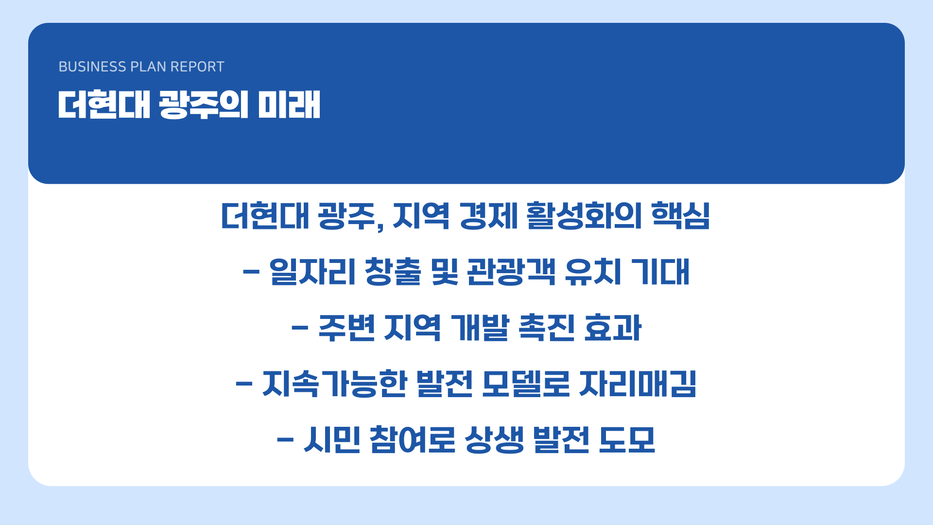 광주는 대규모 복합쇼핑몰이 부족했던 지역으로, '더현대 광주'가 개장하면 지역 상권 활성화, 일자리 창출, 관광객 유입 효과가 클 것으로 예상됩니다. 또한 지역 내 유통·문화산업과의 시너지 효과도 기대할 수 있습니다.