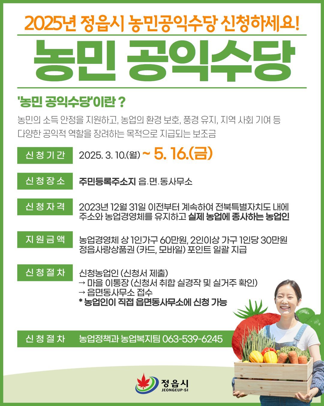 2025년 정읍시 농민 공익수당 신청 기간을 놓치지 말고, 반드시 신청하여 혜택을 받으시길 바랍니다.