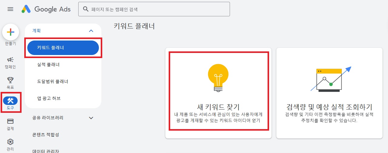 - 구글 광고 계정에 로그인 후 **"키워드 플래너"**에 접근합니다.
