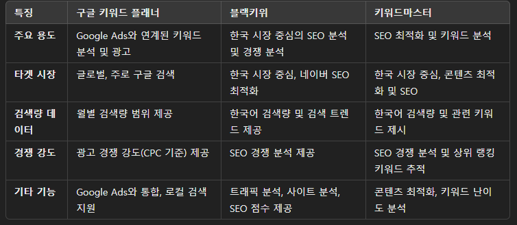 - 키워드마스터는 SEO 최적화 및 콘텐츠 분석에 강점을 가진 도구로, 특히 콘텐츠 최적화와 관련된 유용한 기능을 제공합니다.