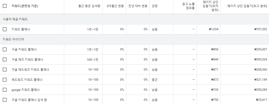 예를 들면 키워드 플래너라고 첬을때 , cpc단가와 월간 검색량등을 확인 할 수 있습니다.