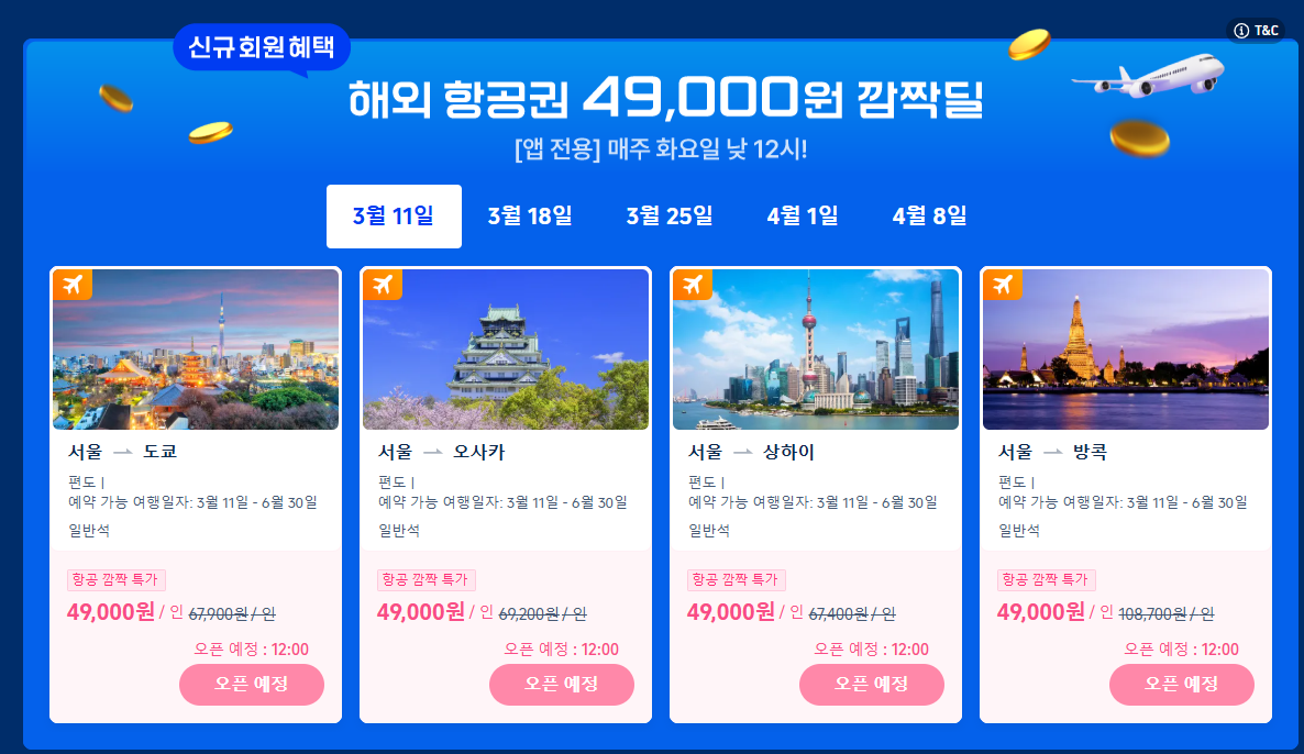 - 초특가 상품: 제주도 왕복 항공권 9,900원, 해외 항공권 1.9만원 등
